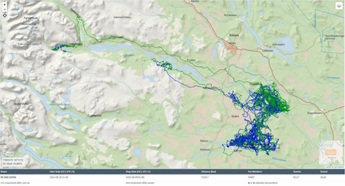 Denna tjur avviker i sitt rörelsemönster med att ha gått så långt österut jämfört med de andra älgarna märkta kring Nikkaluokta.