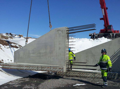 Här placeras de prefabricerade fundamenten på plats, dessa har körts upp med tåg